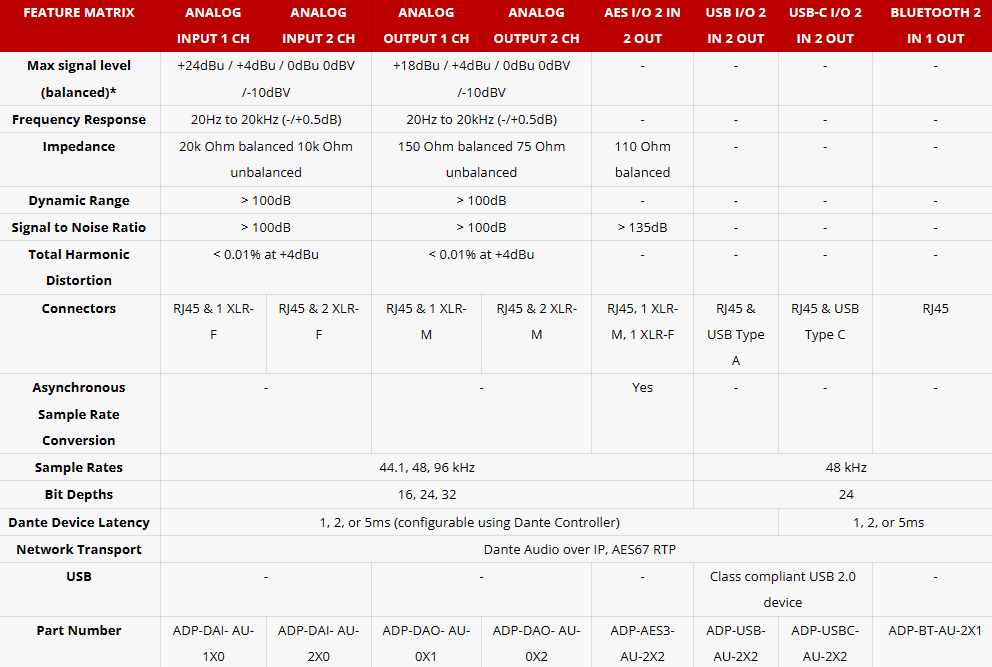 Each Dante AVIO adapter is a complete, high-performance Dante device, with the automation and ease of use that make Dante the world’s most popular audio networking solution. Dante AVIO adapters are all fully-functional Dante interfaces, with all the features you’d expect from Dante audio networking. Each device delivers bit-perfect audio reproduction, super-low latency and sample-accurate synchronization across the entire network.