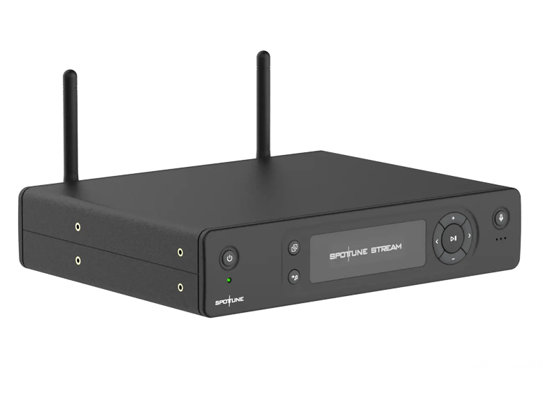 The streams function is to provide wireless audio to all speakers through the internet. Audio can be played from AUX, USB and Microphone. It can also be controlled manually, via the Spottune App or online by the Spottune Cloud system. In collaboration with the speakers, a stable wireless sound is created and is resistant to Wi-Fi noise.