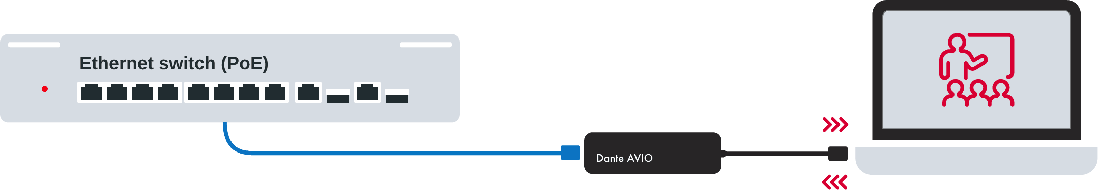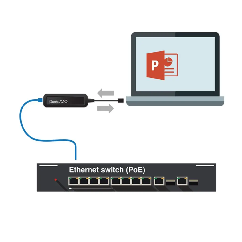Each Dante AVIO adapter is a complete, high-performance Dante device, delivering all the automation and ease of use that have made Dante the most popular audio networking solution worldwide. Dante AVIO adapters are automatically discovered and ready to use when connected, and no separate power supplies are required – just use a common PoE (Power over Ethernet) switch and Dante AVIO adapters are ready to go. The USB adapter can also be powered via USB.