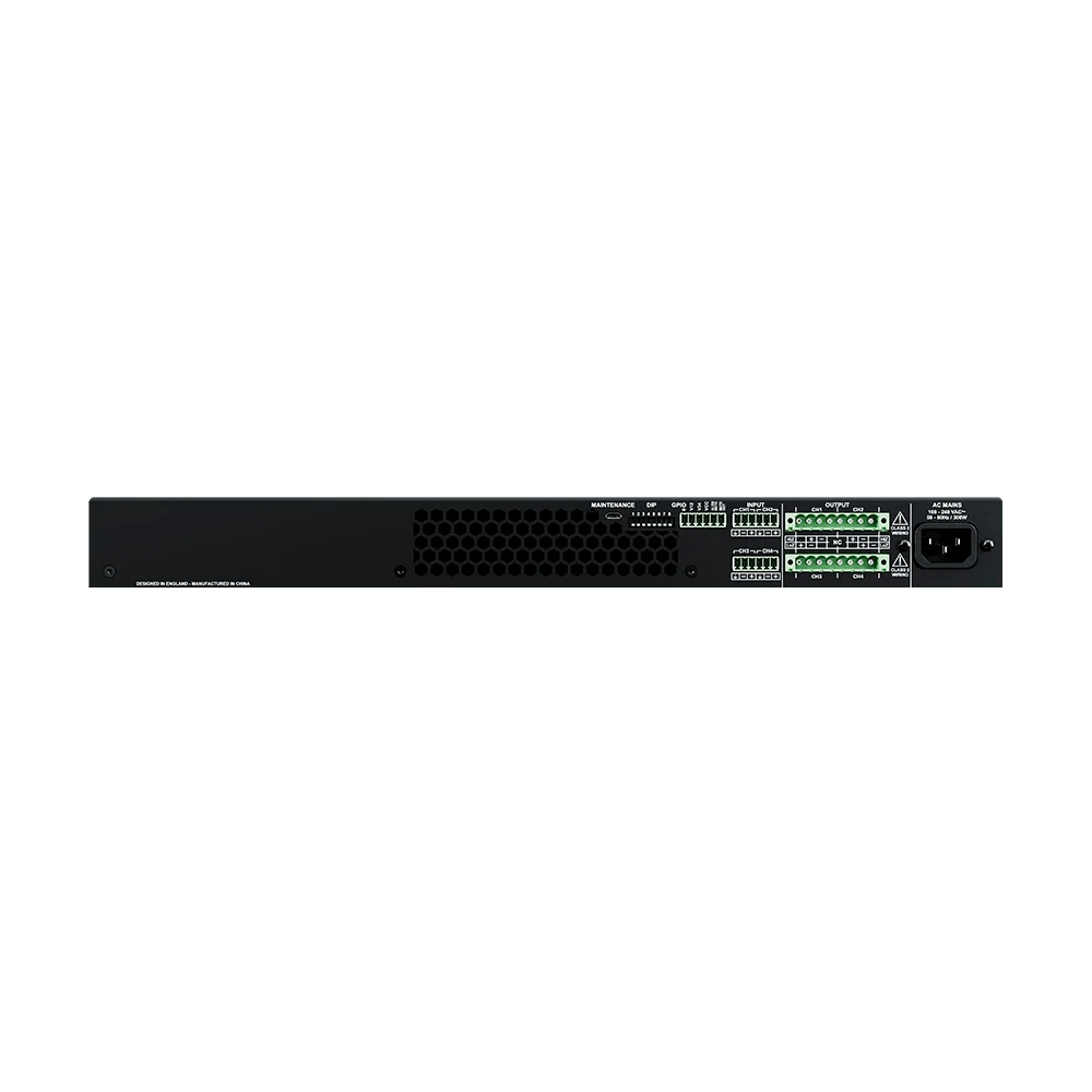 This four-channel 1U, 19”, power amplifier can drive both conventional low impedance and 70V – 100V loudspeaker loads. Internal DSP presets of Optimal Audio loudspeakers are selected by switches to the rear of the amplifier, which enable the appropriate EQ and overload protection settings.