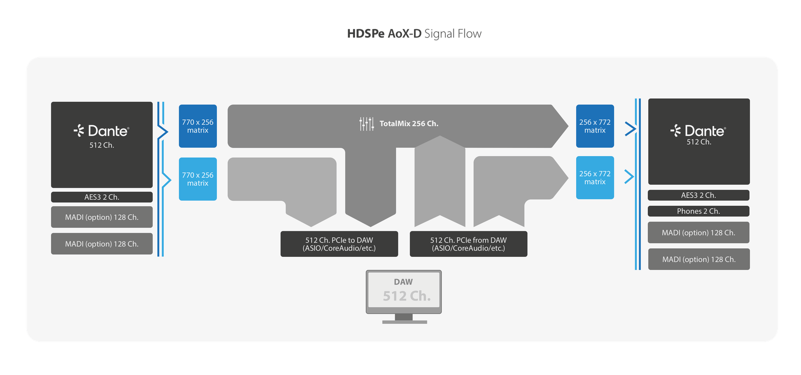 The HDSPe AoX PCIe x4 audio interface cards combine dual network ports with headphone output, AES3, MIDI, and internal expansion headers for up to four MADI ports. Whether used in a Thunderbolt™ expansion chassis or built into DAWs or audio processors, these cards send and receive up to 512 channels of audio and provide numerous mixing and routing capabilities.