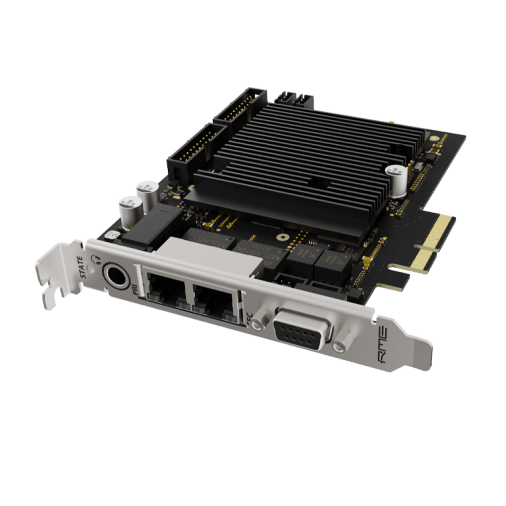 Occupying only a single slot, the PCIe x4 interface transmits and receives up to 512 channels of network audio signals on two separate RJ45 connectors. The network audio channels can partially be replaced (or extended in case of the Milan® version) with MADI signals by adding up to two optional dual optical or dual coaxial extension cards. It is therefore possible to integrate four MADI input signals, four MADI output signals plus up to 256 network audio channels per direction within a single audio interface for the first time – on macOS and Windows.