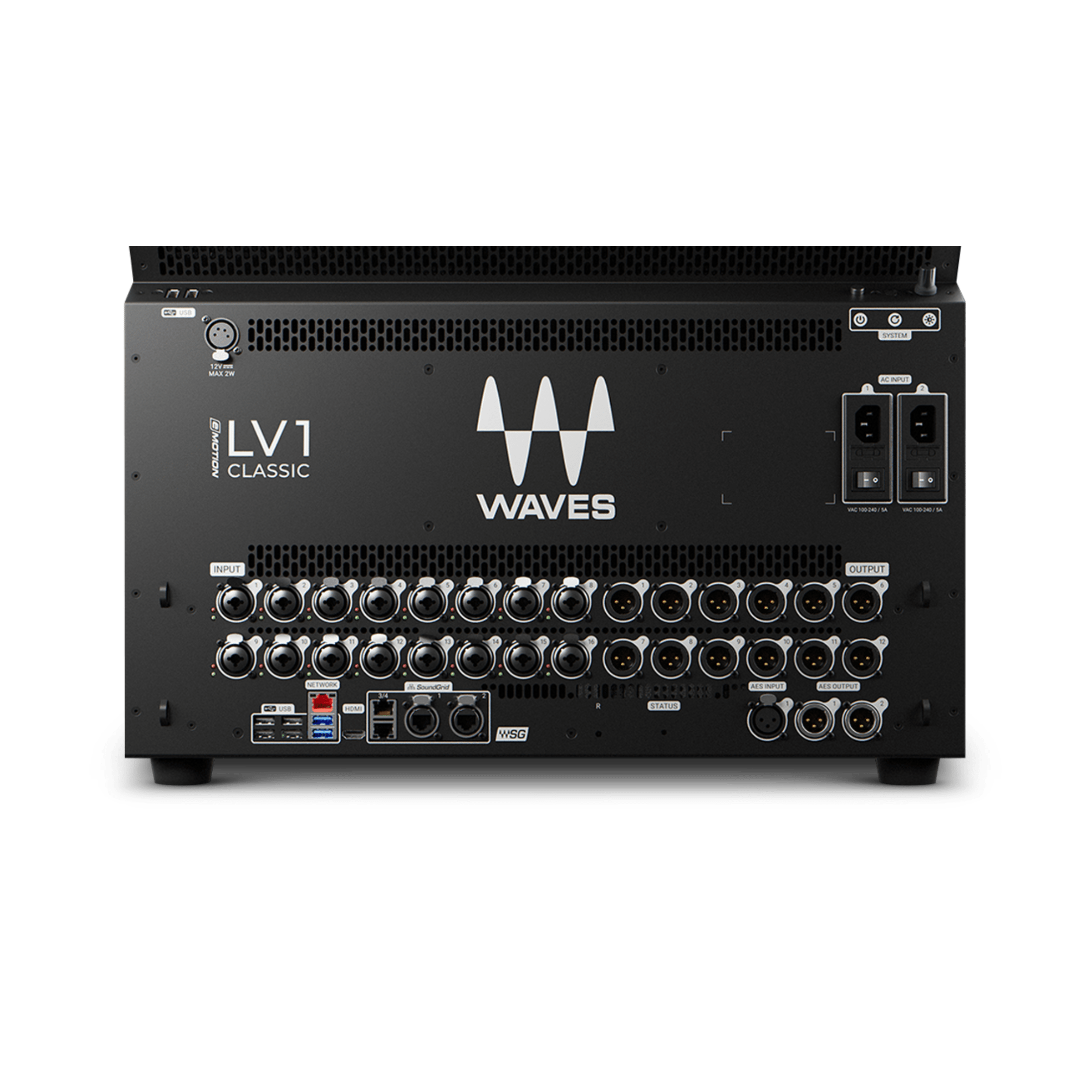 - 12 line outputs, 1AES3 SRC in, 2x AES3 out, 4 SoundGrid ports