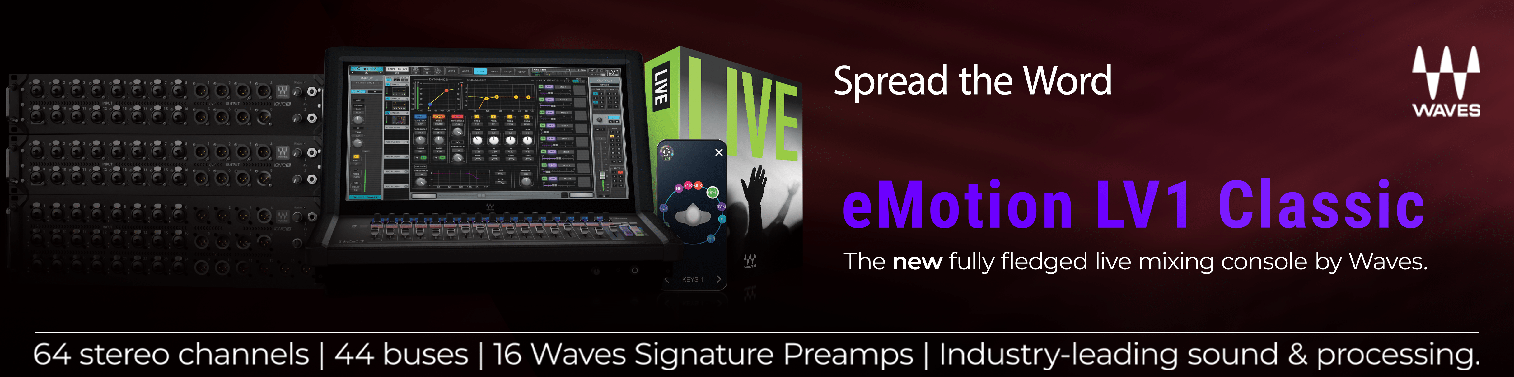 eMotion LV1 Classic builds upon the industry-proven sound quality of the Waves LV1 mixer engine, and delivers its benefits in the preferred console workflow of live sound engineers worldwide.