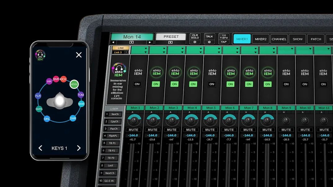 Bring clarity, openness and comfort to in-ear monitors: The eMo IEM plugin is a software-only upgrade to LV1 consoles, turning your LV1 monitor outputs to immersive at the click of a button. No external hardware is required—simply set any of the LV1’s monitor outputs to IEM, and your performers will receive monitor sound in their in-ears, via the Waves MyMon remote control app for LV1.