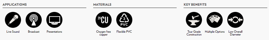 Live sound touring multipin cables from 4 – 48 pairs. Remote stagebox systems. Installation use where a braided overall screen offers a significant advantage over having pre-jacketed pairs – e.g. in a hazardous environment or deteriorated ducting. Any longer length multicore and multipin application where frequent rigging and de-rigging occurs. Presentations use where a neutral jacket colour is required.