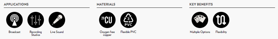 Audio multicore looms for 2 – 48 pairs. Multipin breakout cables. Fixed installations in areas not requiring Low Smoke Zero Halogen cables. Recording and post production equipment interconnects. Wiring of B Gauge & Bantam patchbays where individual screens are required.