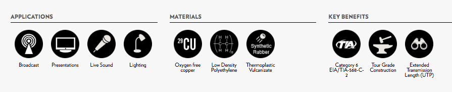 Extended distance touring cables for Ethernet and Ethernet-based protocols. Ideal for use with the Neutrik Ethercon. Polyethylene cross member and TPV jacket ensure protection for the solid conductors in dynamic use. Suitable for Gigabit and 100 Mbit to a maximum recommended channel link distance of 105 metres (U/UTP) or 77 metres (SF/UTP).