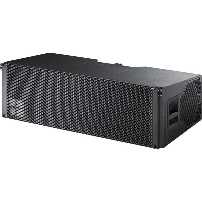 The GSL8 is a line array module specifically designed for largescale sound reinforcement. Up to twenty-four GSL8 loudspeakers can be flown in vertical columns producing an 80° constant directivity dispersion pattern in the horizontal plane. The GSL8 houses two 14″ neodymium forward facing LF drivers and two side firing 10″ neodymium LF drivers. A coaxial mid-high section contains an MF horn with a 10″ driver and three 1.4″ exit, 3.4″ voice coil HF compression drivers mounted to a dedicated wave shaping device. SL-Series flying hardware comes with a patended workflow with integrated tension and compression rigging mode, allowing splay angles between cabinets from 0° to 7° in 1° increments. The loudspeakers are driven actively by two channels of an appropriate d&b amplifier, one channel powering the 14” LF drivers, the second channel powers all other components, these are passively crossed-over. This component geometry allows for a smooth crossover design with well-defined overlaps between adjacent bands providing consistent, even and very accurate horizontal dispersion. Due to the arrangement of the front and side firing LF drivers, accurate directivity control is maintained from 45 Hz to above 18 kHz. The cabinets are constructed from marine plywood and have an impact and weather protected PCP (Polyurea Cabinet Protection) finish. The front and side panels incorporate rigid metal grills backed by an acoustically transparent and water repellent fabric. Each side panel incorporates a recessed handle, with additional handles are provided at the rear.