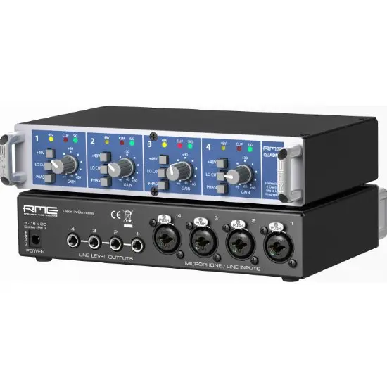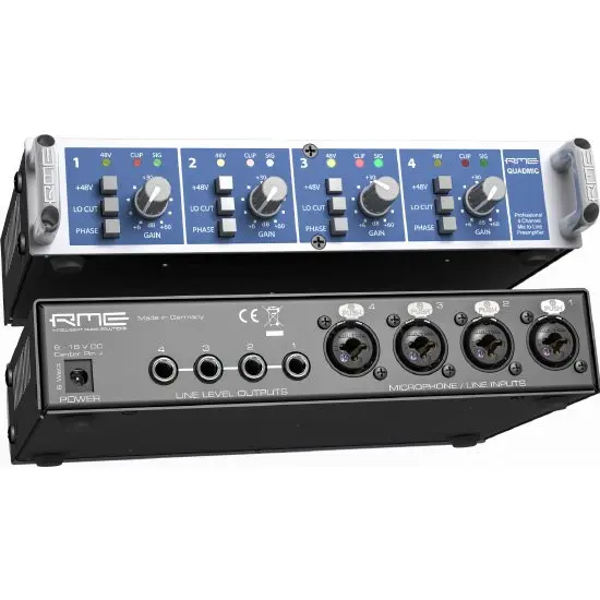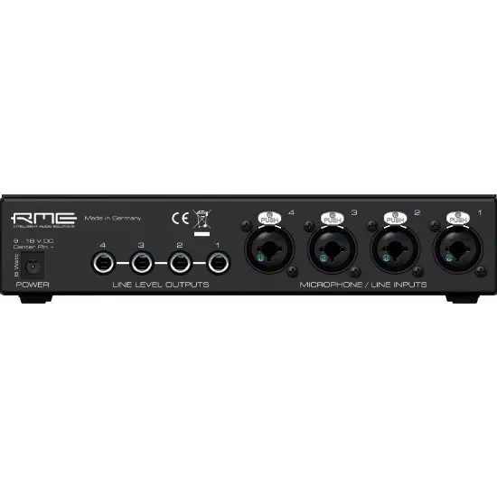The QuadMic II complements any RME system with line inputs by adding external microphone inputs. Since the unit runs on supply voltages from 9 to 18V DC, it can operate on virtually any power source available, including batteries and rechargeable batteries.