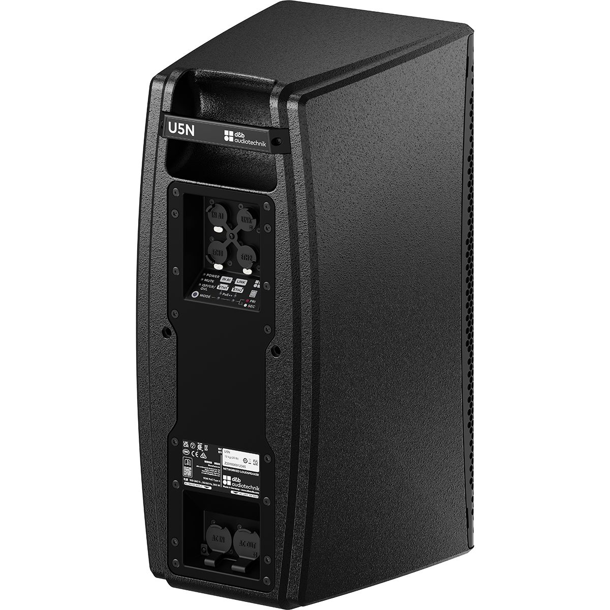 The cabinet is made of highly durable partially recycled ABS and carries an IP54 rating for dust and weather resistance. The front is protected by a rigid metal grille and an acoustically transparent foam. The back has a handle and M10 threated inserts for attaching d&b rigging hardware designed specifically for either mobile or install uses. The U5N can be both mounted or flown, and in single-cable operation it can easily be placed where traditional power is not easily available, bringing significant savings in time and infrastructure costs. When operating on PoE++ U5N can be powered by DN2, the d&b proprietary AVB MILAN PoE++ Network Switch for a rugged, reliable solution or other 3rd party switches with equivalent performance capabilities and certifications.