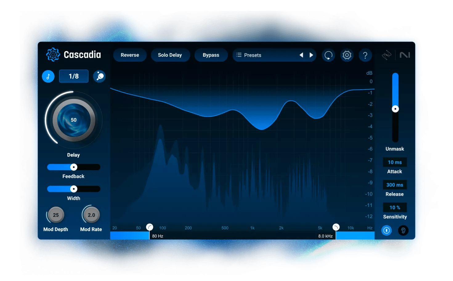 Sculpt your space with beat-synced or time-based delays, ping-pong and reverse delay modes, vintage pitch drift, width control, and an adjustable unmasking section. Wave goodbye to long plugin chains and tedious routing. Find your flow fast with Cascadia’s intuitive controls.