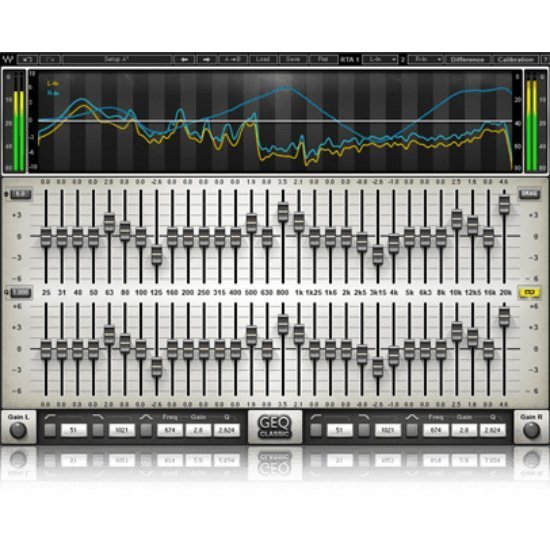 Waves GEQ is a full-featured graphic equalizer plugin with both Classic and Modern mono and stereo components, featuring 30 ISO bands plus high and low pass filters, a high precision floating parametric EQ bell filter, and a real-time analyzer.
