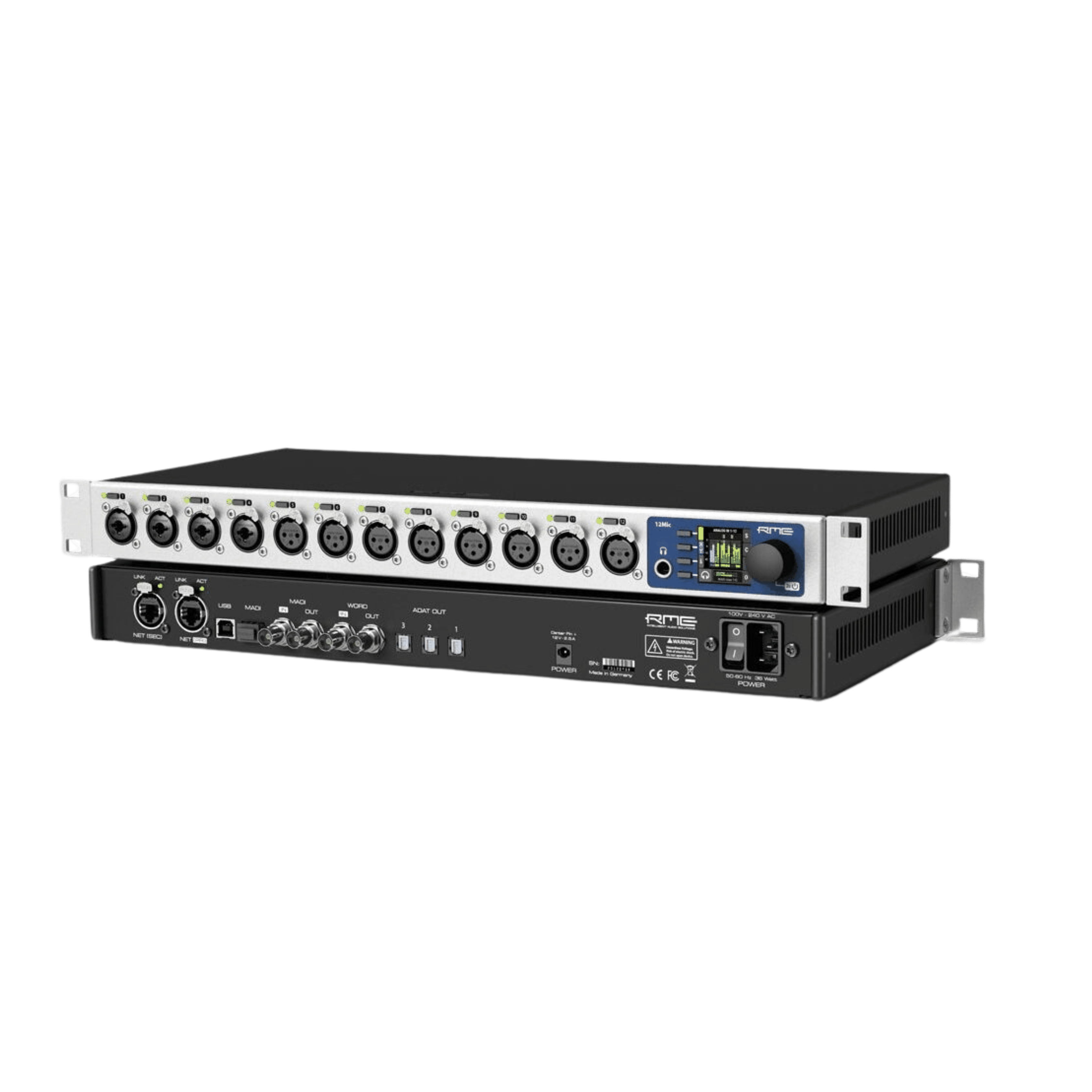 The PAD-free microphone input stages have a 75 dB gain range and accept signals of up to +18 dBu. On the converter side, the 12Mic shines with an outstanding signal-to-noise ratio on all channels. All twelve front-facing XLR connections accept microphone and line level signals, whilst the first four connections also accept TRS connectors, with switchable high impedance (Hi-Z) for instruments.