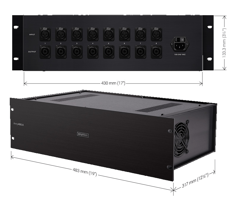 Though Amp400.8 was mainly developed for immersive audio, nothing prevents using it for other multichannel applications as well. As all 8 channels are identical and discreet it can also also be used in a 2-channel environment for driving up to 4 pairs of passive speakers. It will equally drive both 8 ohm and 4 ohm loads, and partners perfectly with all Amphion models. Though Amp400.8 was developed and optimized for Amphion monitors, it provides excellent results with wide range of passive speakers. Neutrik XLR and Speakon connectors offer a convenient and secure way to connect the amplifier to rest of the system.