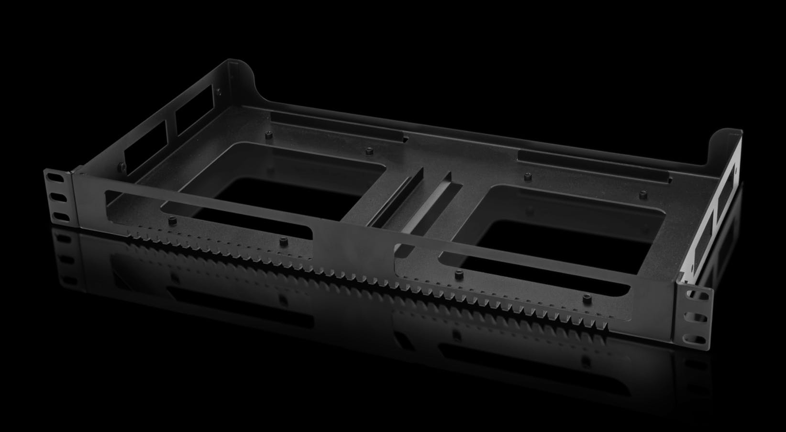 To protect and transport vital equipment, rack-mounting remains the preferred option. This custom-made rack shelf fits two half-rack Proton SoundGrid devices (e.g., Proton Server and Axis Proton Waves-optimized computer) side-by-side, for rack-mounting in a standard 19″ rack frame.